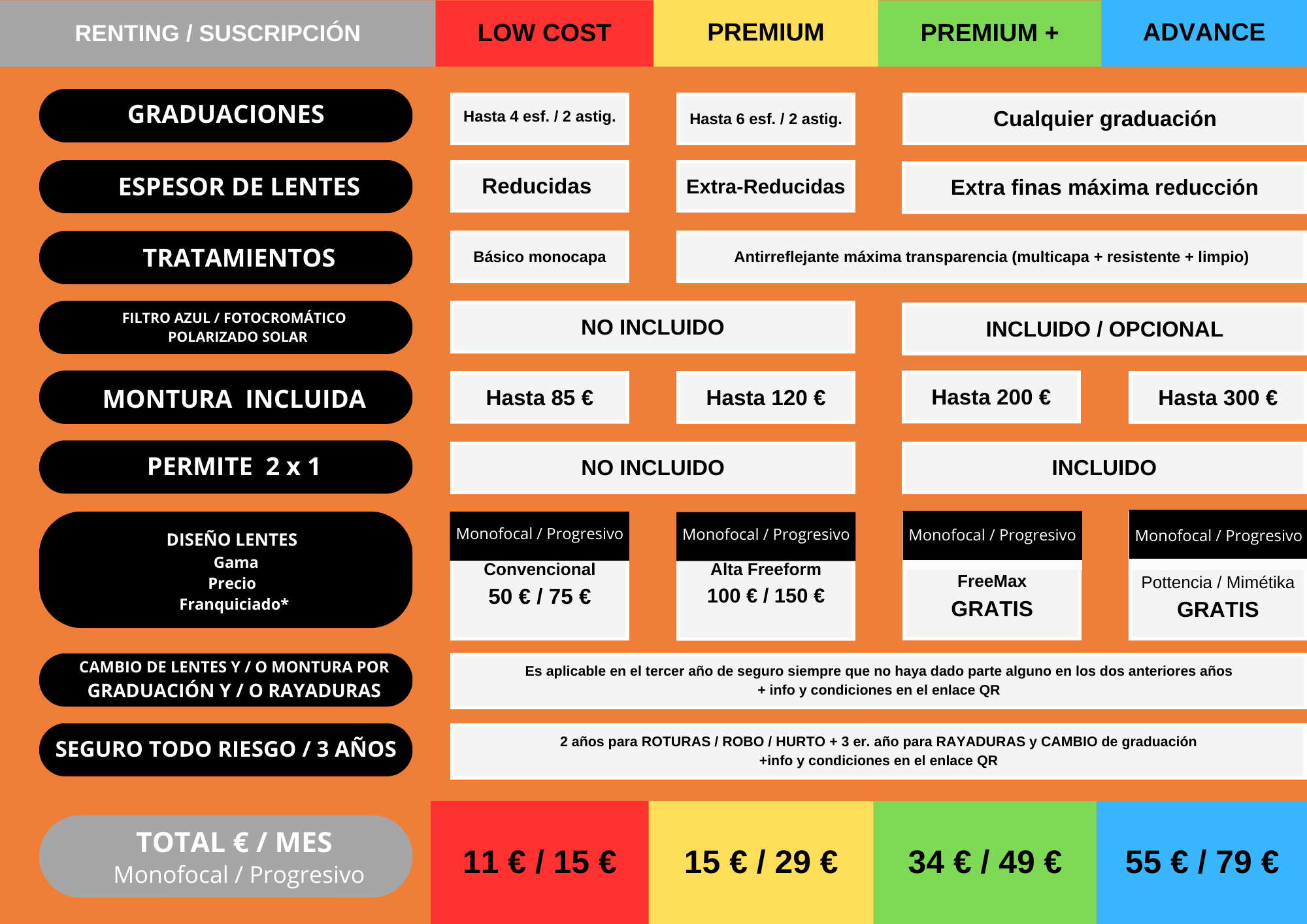 El cambio de lentes graduadas por rayaduras será posible en el tercer año del seguro, siempre y cuando no haya dado ningún parte durante los dos años desde su adquisición. La cobertura tiene vigencia durante el tercer año desde su adquisición y su rango de cobertura estará sujeta al tipo de seguro contratado: LOW COST, PREMIUM, PREMIUM PLUS o ADVANCE.